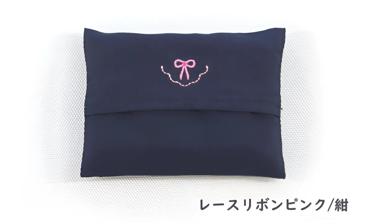 刺繍入りミニティッシュケース 同デザイン5個セット レースリボンピンク 紺地