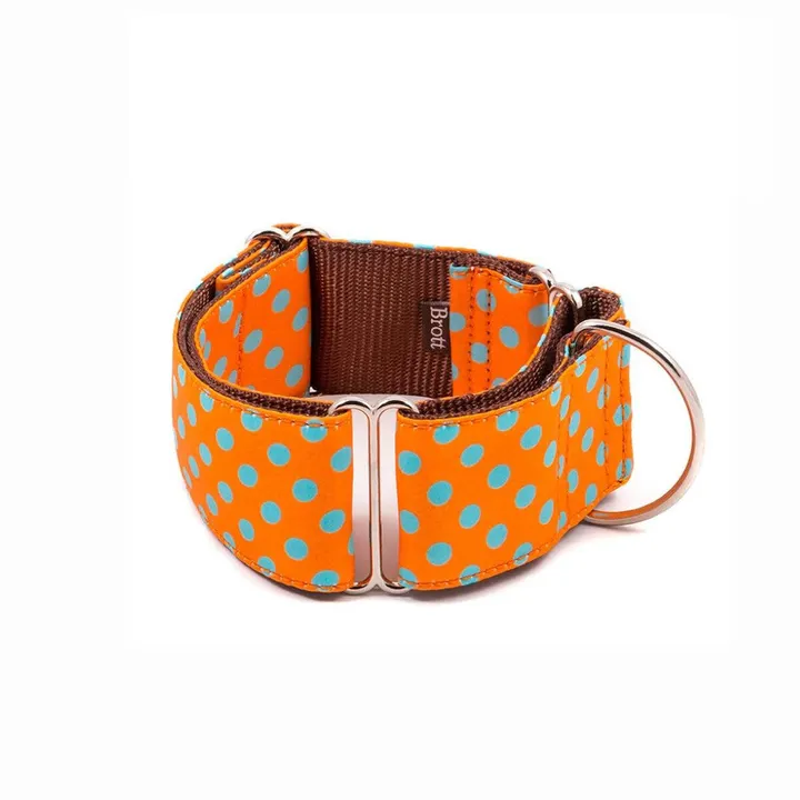 鮮やかなオレンジとターコイズブルーのドット柄が目を引く、Polaの犬用首輪。愛犬の個性を際立たせ、どんなお散歩も楽しくなること間違いなし! ? マーチンゲールカラー 幅が4cm、5cmと通常よりも広め。頭と首が細長く通常の首輪では抜けてしまうハウンド犬種に、特にぴったりのハーフチョークタイプです。 ハウンド系犬種以外でも幅広くお使い頂けます。頭からかぶせて着用するので、頭のサイズも必ずご確認ください。 ? 素材 裏地:ポリエステル100%リボン(エコテックス認証取得)表地:ポリエステル100%Dリング