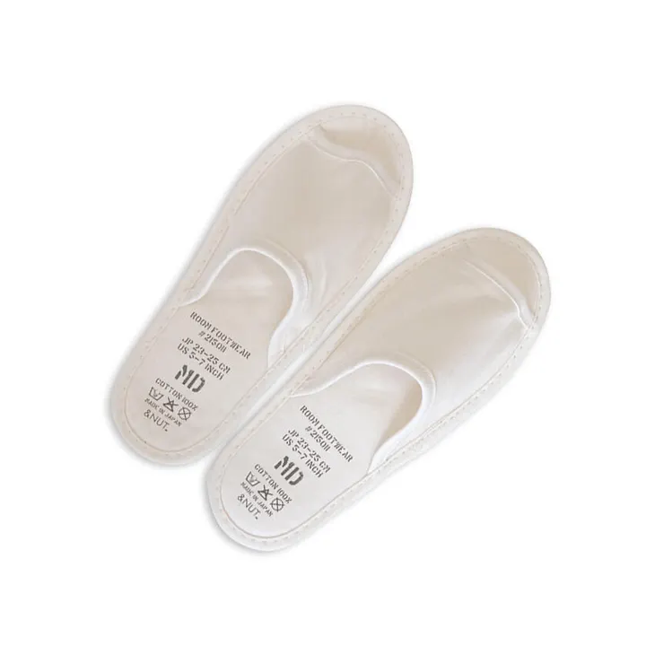 もともとは、アメリカ軍の医療機関で使用(支給)されていた患者さん用のスリッパがベースになっています。 色々なブランドからリメイク版がリリースされていますが、そのほとんどがコンパクトに折りたためるトラベル用として作られているので 家用として毎日使用するには、すこし頼りない感じのものが多いです。 &NUTではしっかりした芯材と少しクッションを入れてヘビーユースにも耐えうる仕様にしています。