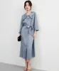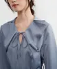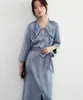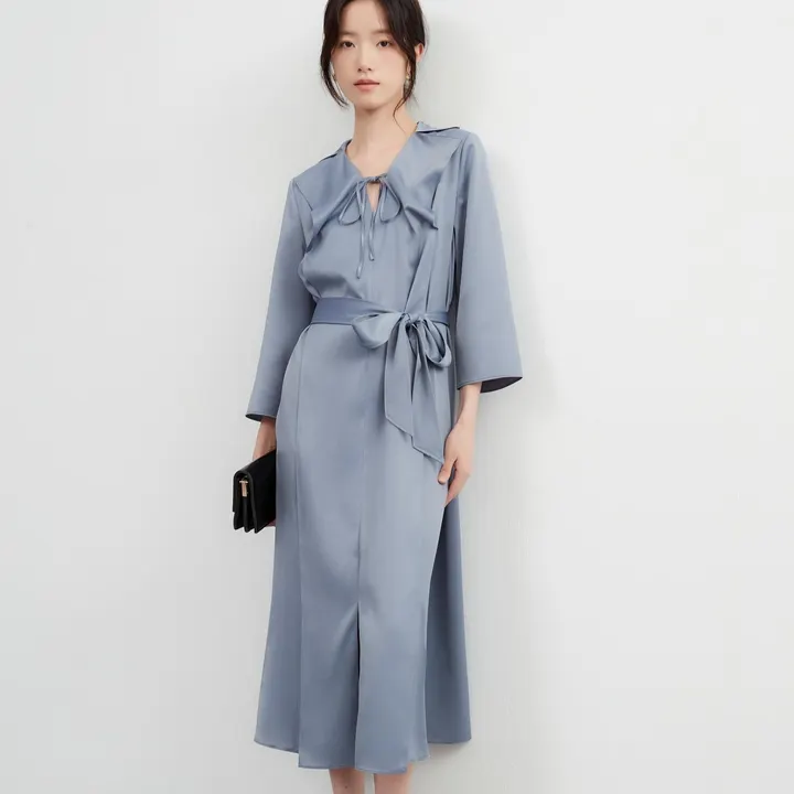 KNXO529・ツヤ感ドレープ素材・切込み衿デザイン・ウエストマーク8分袖カジュアルドレス GRAYBLUE/FREE