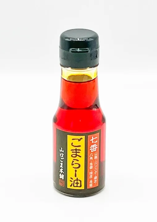 山口ごま本舗謹製のごま油をのみを使用しサラダ油を使わずに作ったごまラー油です。最初にごま油の甘みが口に広がりそして唐辛子の辛さが広がります。ごま油を使用しているので香りがよく、そして辛くて美味いラー油です。