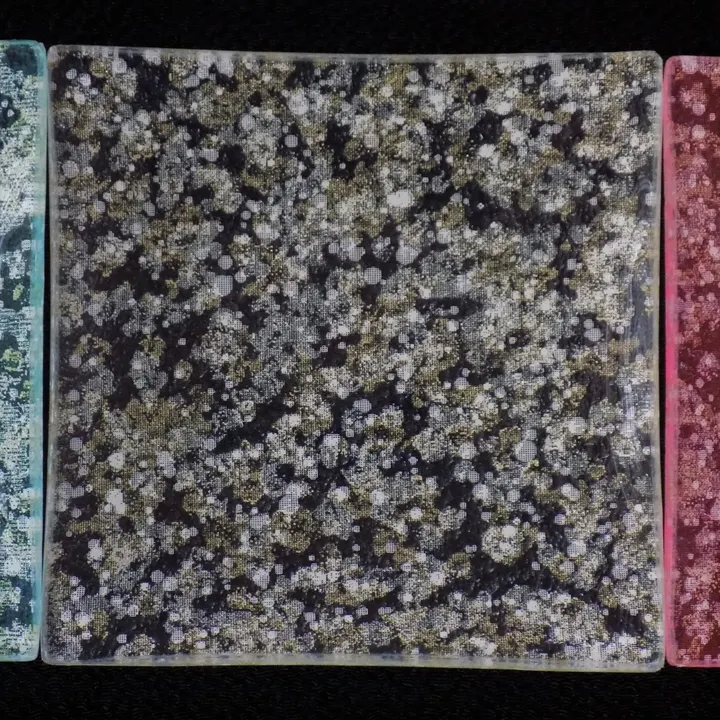 金彩工芸は桃山・江戸時代に確立された帯や着物等布に金箔を施す技術です。 その技術を生かしガラス加工業者とコラボして制作しましたガラス製豆皿になります。 左からブラック・ブルー・水色・シルバー・ピンク 透け感のある生地に中色泥(金と銀の間の色目)・銀泥・胡粉で抽象的な泡のような紋様を摺箔加工。 ※摺箔加工:型紙やシルクスクリーン型を使い、文様を箔等で施す加工 その生地を特殊加工でガラスに貼りつけ樹脂とサンドしてあります。 形状は角形になり ます。 透明感がありますので置かれる背景の色目で表情が変化します。 涼しげなお皿です。 従来の10cm角の豆皿と大きさを比較してください。 サイズは約8cm角×厚み約3mm弱 大切なお客様へお菓子等をのせる豆皿として、また装着してたアクセサリーや鍵などを置くトレイとしてもご活用いただけます。またインセンスプレートとしてもご活用いただけます。 使い方は自由です。 伝統の技術をとじこめたこの品で生活を華やかに楽しんでください。 価格は各1点の価格になります。 ご希望のデザインをお選びください。 ※この商品はオーダーになります。5個未満は約3週間、5個以上は約1か月~お時間をいただきますので、予めご了承ください。 ※画像はサンプルです。同じ版(型)を使っていますが一点一点手作業のため部分的に多少デザインが違う場合がございます。 ※ご覧になる環境により、実際の商品と 色味具合が異なって見える場合があります。 ※加工に伴うガラス表面の僅かなキズ、スレは多少なりございますので、あらかじめご了承ください。