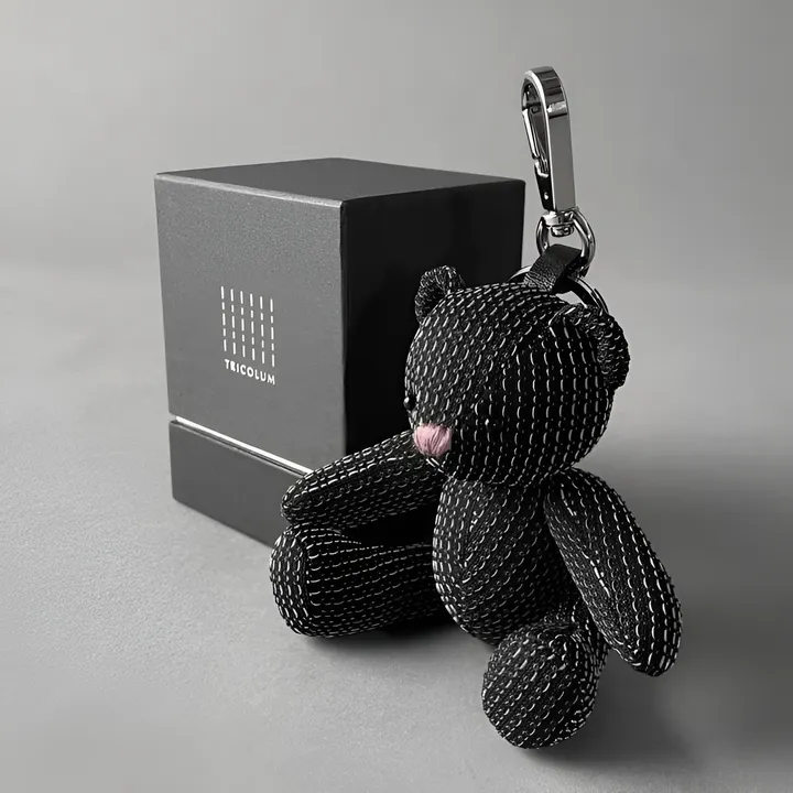 「TRICOLUM」の技術を活かして、リフレクターの糸を編み込んで制作したテディベア「ENTOKUN(えんとくん)」のチャームです。 フラッシュを焚いて撮影すると、輝きます。 ぬいぐるみの生産で一時代を築いた栃木県・おもちゃの街にある工場で型起こしを行い、その関連工場にて制作をしております。通常、毛足のない生地でぬいぐるみを制作すると縫製の誤魔化しが効かず難しいとされるのですが、この特殊な生地で作ったテディベア『ENTOKUN(えんとくん)』は技術の高さが伝わる美しい仕上がりになりました。 手足は可動式です。
