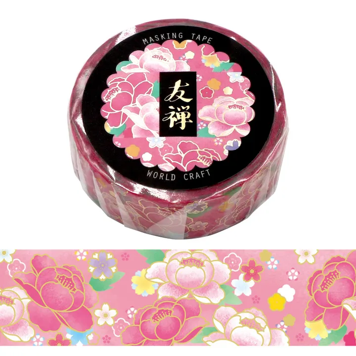 【友禅マスキングテープ15mm 牡丹】 ◎どこか親しみ深く懐かしさをも感じさせられる、  着物の柄で多く目にする牡丹柄です。 ◎花びらの濃淡の柔らかさ、  かわいらしく華やかでありながらも  奥に秘めた慎ましさのあるデザインです。 ◎手紙やポチ袋、年賀状などのデコレーションにおすすめです♪ ---------------------------------------------------------------------------------------  ◇◇ 友禅マスキングテープ 15mm ◇◇ 割付文、着物、生き物文の3つをテーマに、 ゴールド箔が美しい友禅柄<12柄>を揃えました。 文様を多彩で絵画的に表現できる特徴を活かし、 華やかで贅沢、そして細部まで美しい和柄となっております♪ 扇子やうちわ、手紙やポチ袋、年賀状や御朱印帳、収納箱など… 様々なデコレーションにおすすめです◎ <12柄一覧> ●割付文 … 七宝 / 麻の葉 / ねじり梅 / 花菱 ●着物 … 松竹梅 / 牡丹 / 桜 / 菊 ●生き物文 … 雀 / 蝶 / 鶴 / 兎