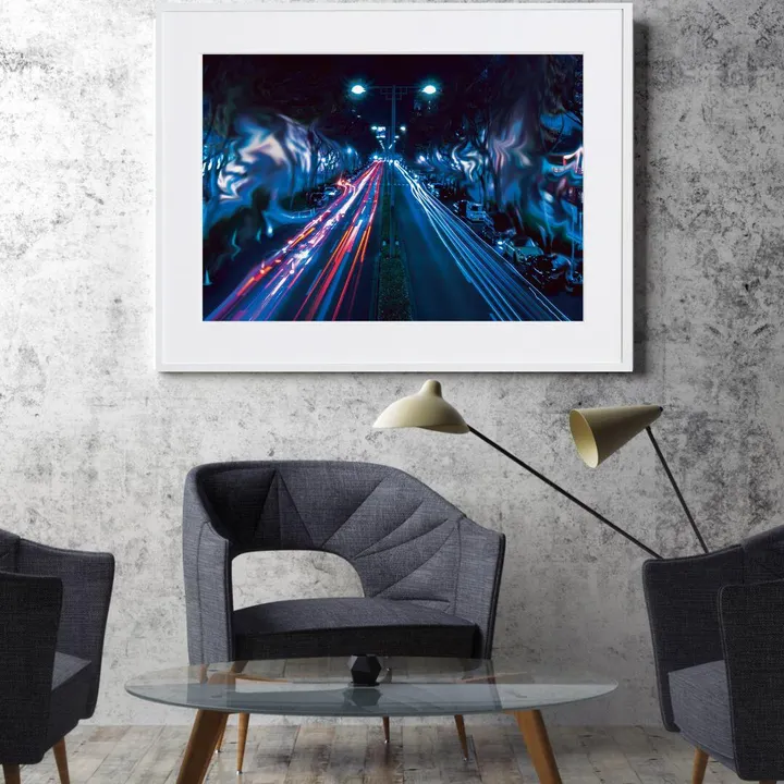 【現代アートポスター】街並み 道路 夜 湾曲 加工 おしゃれ写真. photo A2(L) フレームセット:白 55.1×73.3cm