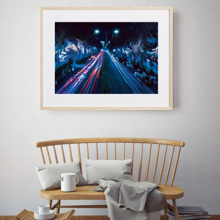 【現代アートポスター】街並み 道路 夜 湾曲 加工 おしゃれ写真. photo A2(L) フレームセット:無垢 56.1×74.3cm