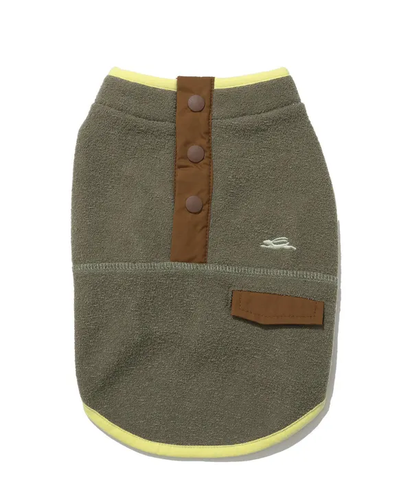 軽くて暖かいのが大好評! 肌触りも柔らかく、ふんわりした風合いが特徴のオリジナルブークレシリーズ! 今年は犬服も登場です! 背中部分と胸ポケットの別生地使いが特徴的で、ポップな配色のスナップT。 スナップボタンはフェイクになっており、面ファスナーで開閉できるのでワンちゃんに負担をかけず、楽に着脱が可能です。 首周りが大きいワンちゃんには、あえて開けて襟を折り返して着せてあげても可愛い一枚です。 S・Mは面ファスナー2つ、L・XL・XXLは3つで調節できます。