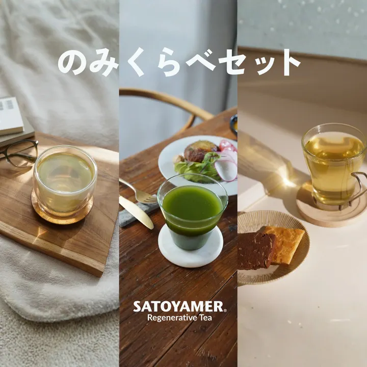 ■SATOYAMER®の味わいを一度に体験する、のみくらべセット のみくらべセットは、SATOYAMER® のラインナップをまとめて試せるセットです。 朝・昼・夜それぞれの時間帯の体験を一度に楽しめることで、あなたの日常に合うお茶を見つけたり、贈りものとしても最適です。 本セットは、SATOYAMER® のブレンドを味や香りの違いを比べながらお楽しみいただけます。これからSATOYAMER® の習慣茶を始める方や、ギフトとして喜ばれるセットです。 ■セット内容(例) OHAYO EVERYDAY(朝用ブレンド/パウダー&茶葉)  朝のめぐりを整え、すっきりとした一日のはじまりをサポートする味わい ITADAKIMASU DAY(昼用ブレンド/パウダー&茶葉)  食事前や日中の切り替えに、すっきりとしたバランスを整える一杯 ITADAKIMASU NIGHT(夜用ブレンド/パウダー&茶葉)  カフェインフリーで夜のくつろぎをやさしく導くブレンド ■のみくらべセットの楽しみ方 のみくらべセットは、単品の味わいを比較したり、日替わりで取り入れながら“自分のリズムに合うお茶”を見つけるのに最適です。 まずはそれぞれのお茶をシーンに合わせて飲み比べてみてください。香りや味わいの違い、飲んだ後のからだと心の感覚の違いが感じられるはずです。 ■アレンジ提案 OHAYO EVERYDAY:水やお湯で混ぜてシンプルに。朝の目覚めに。 ITADAKIMASU DAY:冷やして昼の水分補給にも。 ITADAKIMASU NIGHT:豆乳割りやミルク割りで夜のリラックスタイムに。 それぞれのブレンドの良さを引き立てながら、飲む時間帯や気分に合わせて楽しんでください。 ■こんな方・シーンにおすすめ ・SATOYAMER®の習慣茶をはじめて試してみたい ・朝・昼・夜のブレンドを飲み比べたい ・自分のライフスタイルに合うお茶を見つけたい ・贈りものやギフトとして喜ばれるセットを探している ■商品情報 名称:のみくらべセット(各種ブレンド粉末もしくは茶葉) 内容:OHAYO EVERYDAY/ITADAKIMASU DAY/ITADAKIMASU NIGHT(各パウダー&茶葉入り) 原材料:各ブレンドに準じます(各商品ページをご参照ください) 保存方法:高温多湿・直射日光を避け、冷暗所で保存してください ご注意:開封後はお早めにお召し上がりください