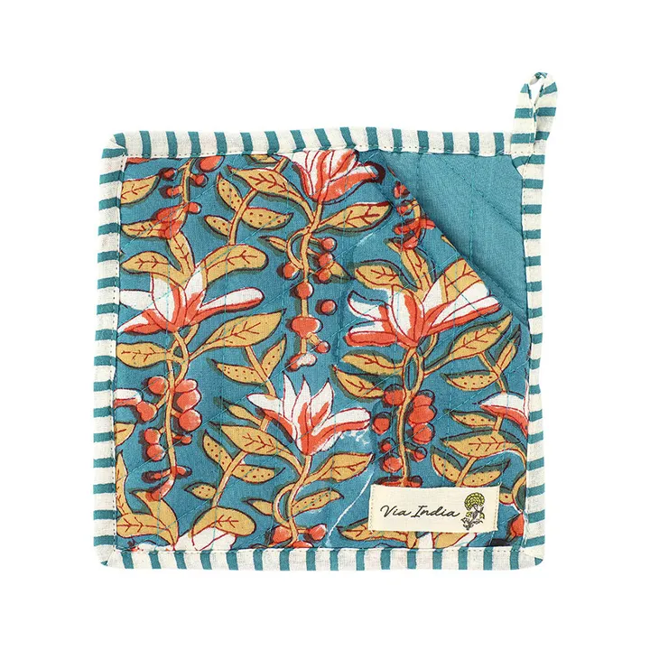 ミトンにもなる便利な鍋敷き。ギフトにもおすすめです。 インドのブロックプリントでデザインされたボタニカル柄の鍋敷き。 裏返せばミトンとしてお使いいただけます。 「カリーノ」は「かわいらしい」という意味。心ときめく配色と素朴な花柄が毎日を彩ります。 「ブロックプリント」は木版を使って、職人がひと版ひと版、手でスタンプを押すように生地の上にプリントするインドの伝統的な技法です。 ※表示数量を超える在庫や、詳しい納期につきましてはメッセージよりお問い合わせください。