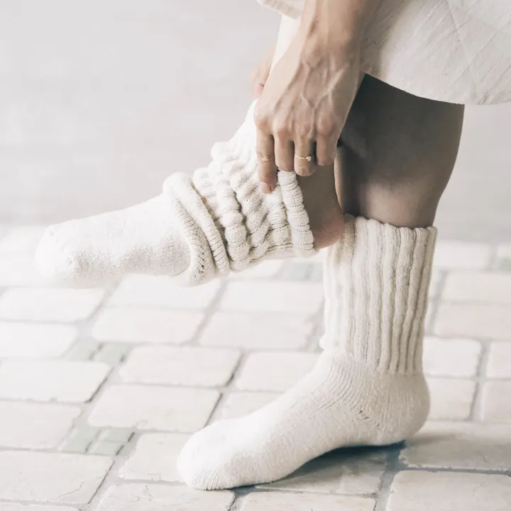 肌寒い季節になると、眠っていても夜中に足の冷たさで目が覚めてしまう…でもくつしたを履いて寝るのは窮屈で好きじゃない…そんな方にぜひおすすめしたいソックス。このガラ紡木綿の厚手くつしたは、裏側が肌触りバツグンのふわふわパイル地。足首の部分はゆるめのゴム編み二重構造で、中のゴムが肌に直接触れないようになっています。余分な締め付けもなく、汗をかいてもしっかり吸収。もちろんルームソックスとしても、重ね履きの外側ソックスとしても十分活躍してくれます。健康の源は安眠から。妊娠中の方やご年配の方へのプレゼントにもぴったりです。