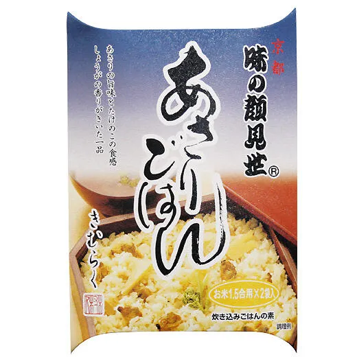 磯の風味豊かな「あさり」をたっぷり使い、刻み生姜と国産筍が入ったオリジナルの炊き込みご飯の素です。 あさりから出る貝独自の出汁は、『コハク酸』と言って天然由来の旨み成分のひとつ。 更に食感の良いスライスした筍を加え、京都らしさをプラス。 それぞれの素材の味を生かした、京風の炊き込みご飯が簡単にご自宅で楽しめます。 炊きあがると、炊き込みご飯の醍醐味、炊飯器の底に『おこげ』が出来ます。サッと混ぜ合わせて香ばしい醤油の香りをお楽しみ下さい。 炊き立てはもちろん、おにぎり、お弁当にもご利用いただけます。 小人数のご家庭でも使いやすい様に、1.5合用(2人前)が2袋入っています。あさりごはんの素 箱入り 3合用(1.5合用×2袋)