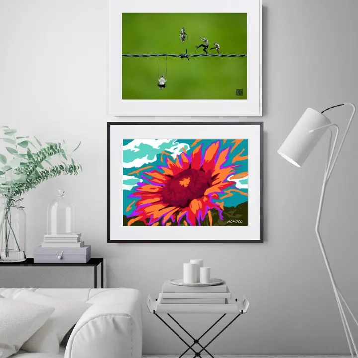 アーティスト -PROFILE- MOMOCO(モモコ) 「色」をこよなく愛する画家、ライブペインター。 躍動感あるアートにも関わらず、服を一切汚さず短時間で音楽と同時に描き上げる。そのパフォーマンスと巨大アートは観る人を魅了する。 前職は某有名ファッションブランドにてデザイナーとして活躍。その経験の中で養われた「色とデザイン」の絶妙なバランスを活かしつつ、トレンドを取り入れ進化し続けるアートを目指す!国内外問わず、精力的にアートと向き合い発信を続けている。 【作品について】 ビタミンカラーが目を引く!ポップなデザイン 眺めるだけで日々の活力になるような、そんな元気をもらえる素敵な作品 子供部屋や、キッズルームにもおすすめです 作品名:himawari Ⅲ 手法:デジタル、イラスト ペーパー:高品質半光沢紙 マットカラー:白 マット*:DXホワイト芯 100%バージンパルプ/PH7・中性紙(2mm厚) ※全てのアートにマットがつきます フレームカラー:黒、白、無垢(3種類から選択) ※マット付のため通常とはフレームサイズが異なる規格となります。 【マット*とは?】 アートポスターの周りに挟んだ厚紙の事。 マットを使わない時に比べ余白により広がりが生まれ、作品の新たな一面を引き出せ作品の見栄えがグッと良くなります。また、額縁のガラス面と作品が直接触れたままにしておくと、くっついて作品を傷つけることがあります。マットを使用することでガラスと作品の間に空間ができ、作品を保護することができます。ブランドコンセプトにより全てのアートにマットがつきます。 ー ファッションのようにアートを ー 私達が掲げるコンセプトです! 毎日着替えるファッションの様に、アートも気軽に飾り変えて欲しい... 一旦飾り終えたアートにも光を当ててほしい... ポスター単体、またはリピートで中身だけのポスターを購入された方に"専用のハンガー"をセットでお届け。 「今までに無い!新しいアートの飾り方を提案」 飾る事がなくなった前のアートをハンガーにかけて洋服と一緒にかけてもらう。 その日の気分や、モチベーションですぐに取り換えられる様に。 もちろん、魅せる収納としても今までにないおすすめの飾り方です。