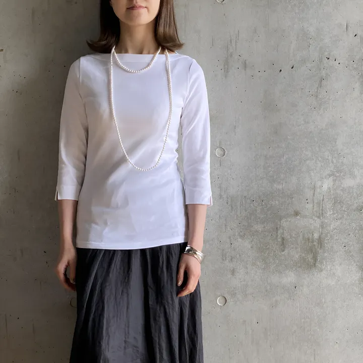 【日本製】丸胴コットンフライス_ボートネック7分袖 ホワイト 2-3サイズ