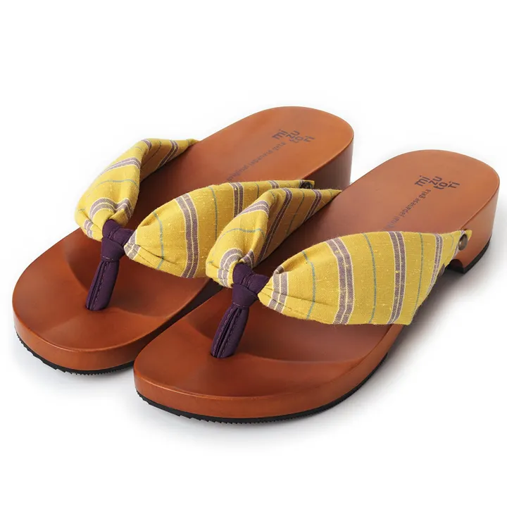 穏やかな黄色が温かみのある遠州織物とよく合って優しい印象を与えてくれる1足。和装にもカジュアルなスタイルのアクセントにも◯