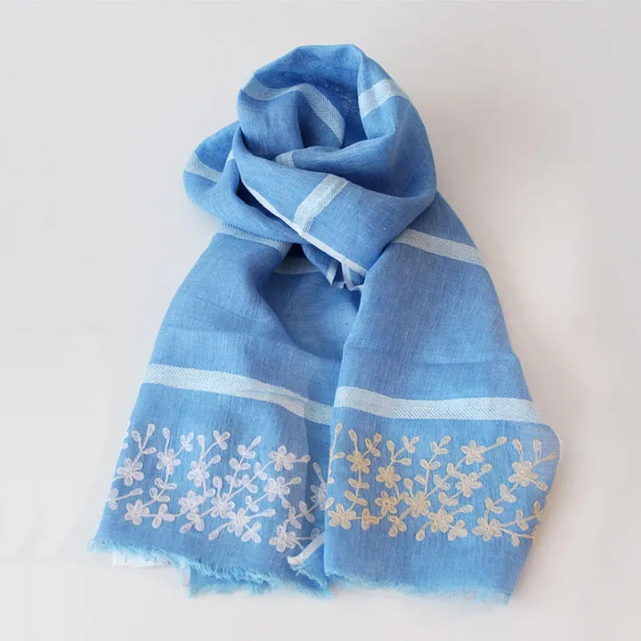 【ボリュームを少し抑えたスカーフタイプ】 デリケートな首元にもチクチクすることがない上質リネンを使ったオリジナルのリネンススカーフです。上質で軽やかなリネンは、使い込むほどに柔らかく肌に馴染んでいきます。 ☑ コンセプト 「健康」「環境」「造り」をコンセプトにしたインテリアショップ自社開発のリネン製品 ☑ 天然素材100% 天然素材100%の高品質なアイテムを使いやすい価格で「リネン製品をもっと気軽に」 ☑ 低ホルムアルデヒド 定期的に国内でホルムアルデヒド検査を実施、お子さまからお年寄りまでからだにも環境にも安心 【オールシーズン使える上質リネン】 リネンって夏だけ?と思っている方はサラッとした肌触りながら、やさしい暖かさに驚かれると思います。 あたたかい素材のストールは気分じゃない・・・ 映画館や観劇で肌寒くなってしまう・・・ そんなときも、リネンスカーフなら重くなりすぎず、季節の変わり目にも重宝します。 もちろん、夏の室内での冷房対策や首元の日焼け防止にも。持ち歩くときは、バッグに結んでしまってもアクセントに。無造作にバッグにつっこんでもなぜかサマになります。 【デザイン】 ベースのボーダーラインは織にアクセントをつけ、両サイドにもちいたリーフの刺繍はサイドごとに刺繍糸の色を変えることによりシンプルでもあり、華やかさもある使い分けができるデザインにしました。 ■ホワイト オフホワイトのベースにクリーム色の糸で織り柄を変えたボーダーラインをデザイン。両サイドの刺繍部分はベージュピンクとアザレアピンクでエレガントにもカジュアルにも、2WAYでご使用いただける配色にしました。 ■グレー グレーのベースに少し薄いグレー色の糸で織り柄を変えたボーダーラインをデザイン。両サイドの刺繍部分はホワイトとベージュでさり気なくアクセントを付けた配色にしました。 ■ブルー ブルーのベースにライトブルー色の糸で織り柄を変えたボーダーラインをデザイン。両サイドの刺繍部分はベージュとホワイトでいろいろな色合いの装いに合うようにかろやかなデザインに配色しました。 ■ピンク コーラルピンクのベースににベビーピンク色の糸で織り柄を変えたボーダーラインをデザイン。両サイドの刺繍部分はベージュとライトローズで配色。ピンクというと可愛らしすぎるイメージがありますが、大人ピンクでデザインしました。