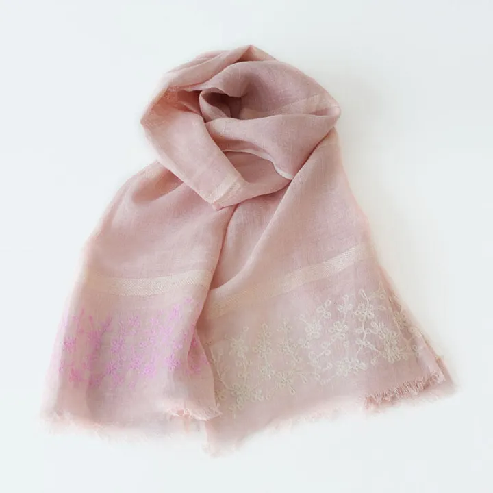 【ボリュームを少し抑えたスカーフタイプ】 デリケートな首元にもチクチクすることがない上質リネンを使ったオリジナルのリネンススカーフです。上質で軽やかなリネンは、使い込むほどに柔らかく肌に馴染んでいきます。 ☑ コンセプト 「健康」「環境」「造り」をコンセプトにしたインテリアショップ自社開発のリネン製品 ☑ 天然素材100% 天然素材100%の高品質なアイテムを使いやすい価格で「リネン製品をもっと気軽に」 ☑ 低ホルムアルデヒド 定期的に国内でホルムアルデヒド検査を実施、お子さまからお年寄りまでからだにも環境にも安心 【オールシーズン使える上質リネン】 リネンって夏だけ?と思っている方はサラッとした肌触りながら、やさしい暖かさに驚かれると思います。 あたたかい素材のストールは気分じゃない・・・ 映画館や観劇で肌寒くなってしまう・・・ そんなときも、リネンスカーフなら重くなりすぎず、季節の変わり目にも重宝します。 もちろん、夏の室内での冷房対策や首元の日焼け防止にも。持ち歩くときは、バッグに結んでしまってもアクセントに。無造作にバッグにつっこんでもなぜかサマになります。 【デザイン】 ベースのボーダーラインは織にアクセントをつけ、両サイドにもちいたリーフの刺繍はサイドごとに刺繍糸の色を変えることによりシンプルでもあり、華やかさもある使い分けができるデザインにしました。 ■ホワイト オフホワイトのベースにクリーム色の糸で織り柄を変えたボーダーラインをデザイン。両サイドの刺繍部分はベージュピンクとアザレアピンクでエレガントにもカジュアルにも、2WAYでご使用いただける配色にしました。 ■グレー グレーのベースに少し薄いグレー色の糸で織り柄を変えたボーダーラインをデザイン。両サイドの刺繍部分はホワイトとベージュでさり気なくアクセントを付けた配色にしました。 ■ブルー ブルーのベースにライトブルー色の糸で織り柄を変えたボーダーラインをデザイン。両サイドの刺繍部分はベージュとホワイトでいろいろな色合いの装いに合うようにかろやかなデザインに配色しました。 ■ピンク コーラルピンクのベースににベビーピンク色の糸で織り柄を変えたボーダーラインをデザイン。両サイドの刺繍部分はベージュとライトローズで配色。ピンクというと可愛らしすぎるイメージがありますが、大人ピンクでデザインしました。