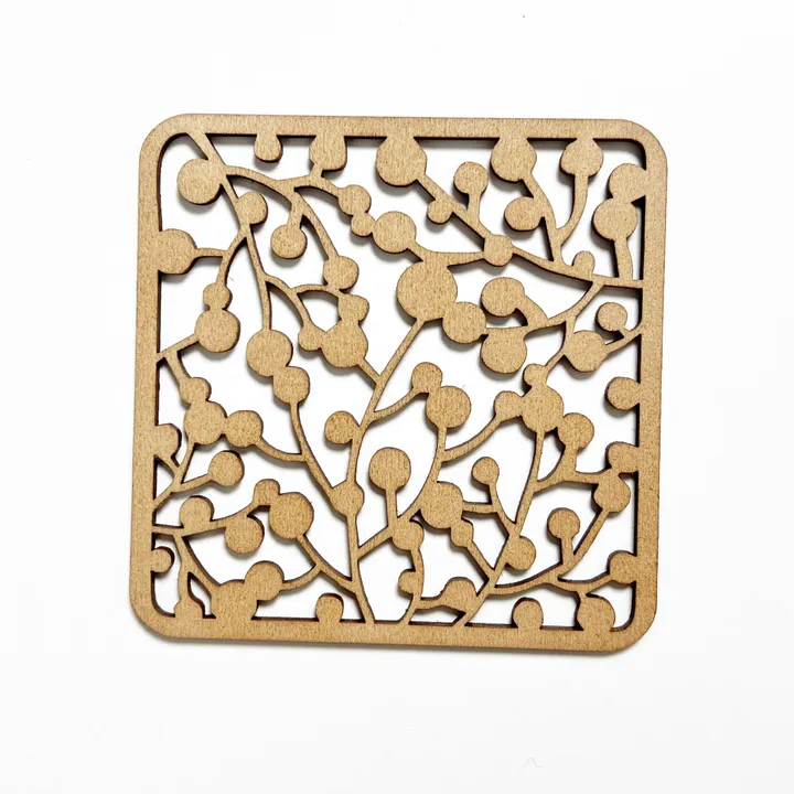 リトアニアで製作しているコースターです。 焼け跡の残らない技法を使用し、レーザーで切り抜いたデザインです。