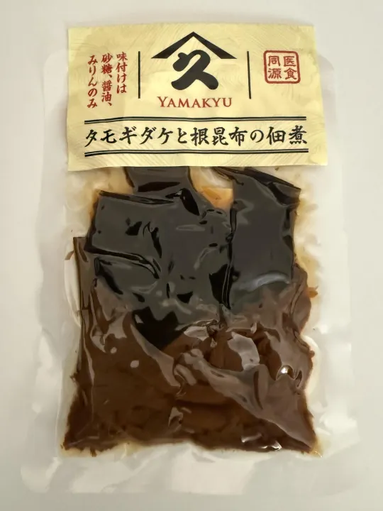 タモギダケの水煮にタモギダケエキスを加えて砂糖、醤油、みりんで味付けした製品と北海道日高産の根本の部分のみを佃煮にした製品の炊き合わせです。 タモギダケに免疫機能を高める成分が多く含まれており、また昆布の根本はミネラルが非常に多く含まれております。健康に大きく寄与する製品になっています。