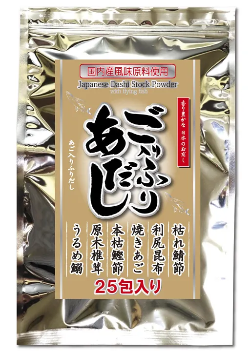 厳選した国産風味原料(鰹節・うるめ鰯・焼きあご・さば節・椎茸・昆布)を使用した本格和風だしです。あごをプラスした深い味わいを簡単においしくできるこだわりの商品です。 ●品名:和風だし(ティーパックタイプ) ●原材料:食塩(国内製造)、砂糖、鰹節粉末、鰹だし顆粒、鯖節粉末、煮干うるめ鰯粉末、粉末醤油、飛魚粉末、椎茸粉末、昆布粒、食用植物油脂/調味料(アミノ酸等)、乳酸カルシウム、(一部に小麦・さば・大豆を含む) ●本品に含まれるアレルギー物質:小麦・大豆・さば JANコード 4944896202338