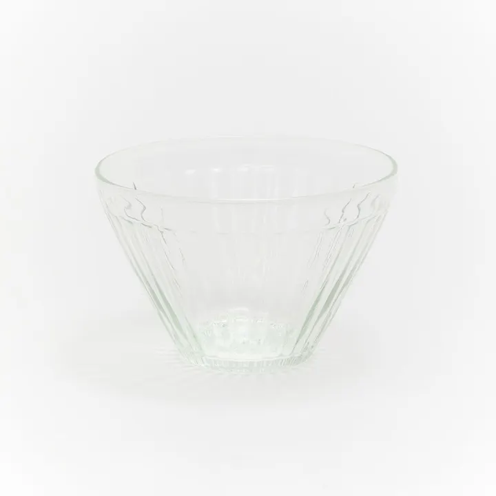 テーパー型のボウルです。 Lサイズは、かき氷やデザートを入れるお皿として、サラダの取り皿として、Sサイズは、デザートを入れるお皿として、副菜やディップソース、薬味をいれるのにもぴったりなサイズ感です。 【リューズガラスについて】 リューズガラスとは再利用されたガラスのことで、一般的には「リサイクルガラス」や「再生ガラス」とも呼ばれています。 一度は捨てられたり不要になったガラスをリサイクルして使っているため、環境にやさしいサスティナブル( Sustainable =持続可能)な社会への取り組みとしても注目されています。 リューズガラス製品は一つひとつが職人たちの手によるハンドメイド。 炉(ろ)で溶かしたガラスを竿(さお)ですくい取り、型の中で息を吹き込みながら作る「型吹き成形」という技法で、たとえ同じ型のシリーズであっても、全く同じ仕上がりになるということはありません。 ガラスの流れや小さな気泡、口の部分に盛り上がった箇所などがあったりしますが、これは吹き竿からガラスをカットした後、熱処理した時にガラスが流れてできるもので、これもまた吹きガラスの特徴です。 ハンドメイドならではの、ガラス表面に生まれるわずかな“しわ”や小さな気泡、繊細な表情の違いなどをお楽しみください。 ※リューズガラスは再生ガラスを使用した当社商標登録商品です。 【ガラス】【インテリア】【ナチュラル】【エシカル(エコ素材)】【12/1】【リサイクルガラス】【X】