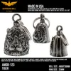 アメリカ製ガーディアンベル社製ガーディアンベルです。 MADE IN USA アメリカ製 交通安全 魔除け 御守り ガーディアンベル アメリカのライダーの間には、事故や、転倒の原因は「道路にひそむ悪魔」によるいたずらだという伝説があります。悪魔は走る者に悪戯やトラブルを運んできます。このベルは美しい音色で悪魔たちを追い払うと言われ愛されています。そんな悪魔のいたずらを防ぎ、御守りとなるのが、守護者のベルという意味を持つガーディアンベル。 日本でも鈴の音(ね)は神道では魔除けの音と言われています。ピューター製の鈴でいい音色でガーディアンベルはデザインも様々あります。 またガーディアンベルにまつわる伝説として、プレゼントとして送られたベルの効果は、自分で手に入れたものの2倍になると言われています。 それゆえに彼氏・彼女・友達・家族へのプレゼントとしての人気も非常に高まっています。 シルバーアクセサリーのようにおしゃれに装着できて素敵な音色を奏でるガーディアンベル。 バイカー以外にも自転車や旅・交通安全のお守りとしてお使いいただけます。 カバン・ランドセル・キーホルダー・ペットの首輪等に付けてお使いください!! ※タイラップ等でバイクのフレームにも簡単に取り付けできます。 アメリカンモデルだけではなく、旧車ファン、レプリカライダーまで、さらにバイクだけでなく、自転車や車にもピッタリな御守りとなっています。 アクセサリーとしても人気で、アイディア次第で車体だけでなく、キーホルダーや鞄など、どこにでも付けておしゃれに楽しめます。