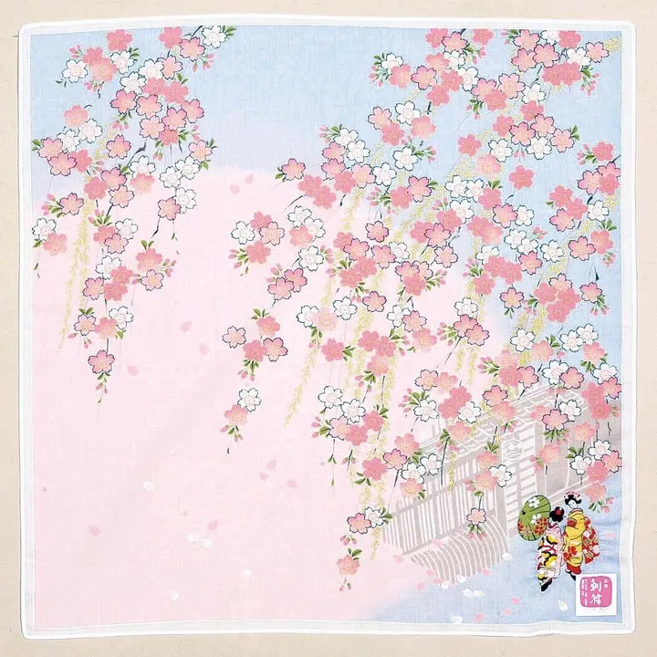 友禅刺繍 ハンカチ「京友禅」は、江戸時代より町人文化と共に受け継がれ、近代では様々な染色技法による表現が見られ、日本における模様染めの代名詞として使われるほど、世界的にもよく知られています。 淡い色彩で柄を切り替えることで、豊かで雅な情緒を表現し、その上に写実的な紋様をあしらいました。ハンカチの右下にワンポイントの刺繍を施した、日本の美しいハンカチです。 ハンカチに使用した「綿ローン素材」は、薄手でさらっと軽やかな平織の生地。肌触りがよく、高級感がある素材です。 舞妓(まいこ)枝垂れ桜を全面に描き、ワンポイントの刺繍では、京都の伝統文化である「舞妓」の優雅で華麗な姿を表現したハンカチです。