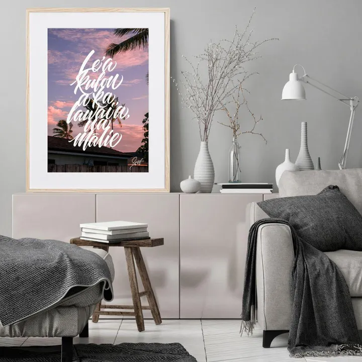 アーティスト -PROFILE- MAHALOVE Surf(マハラブ サーフ) kenigrafia 東京都出身 / Creative art letterer 2019年よりハンドレタリングを主に活動を始め、Blushpen、Rulingpen、Parallelpen、Woodburning、Procreateなどを操りロゴデザインやアート作品の製作に情熱を注ぐ。 MAHALOVE(マハラブ)から派生したブランド 『surf』を手がける。 【作品について】 Le’ a kulou a ka lawai’a, ua mālie ハワイのことわざで「今を楽しみなさい」と表現されています。 mālieの単語では、穏やかな、平穏な、という意味。 私達を魅了する神秘の国ハワイ。 そんなハワイの夕焼け空を美しく写真に収めました。 また、手書きのカリグラフィーがセンスいいアートです。 作品名:Hawaii mālie 手法:写真、デジタル、カリグラフィー ペーパー:高品質半光沢紙 マットカラー:白 マット*:DXホワイト芯 100%バージンパルプ/PH7・中性紙(2mm厚) ※全てのアートにマットがつきます フレームカラー:黒、白、無垢(3種類から選択) ※マット付のため通常とはフレームサイズが異なる規格となります。 【マット*とは?】 アートポスターの周りに挟んだ厚紙の事。 マットを使わない時に比べ余白により広がりが生まれ、作品の新たな一面を引き出せ作品の見栄えがグッと良くなります。また、額縁のガラス面と作品が直接触れたままにしておくと、くっついて作品を傷つけることがあります。マットを使用することでガラスと作品の間に空間ができ、作品を保護することができます。ブランドコンセプトにより全てのアートにマットがつきます。 ー ファッションのようにアートを ー 私達が掲げるコンセプトです! 毎日着替えるファッションの様に、アートも気軽に飾り変えて欲しい... 一旦飾り終えたアートにも光を当ててほしい... ポスター単体、またはリピートで中身だけのポスターを購入された方に"専用のハンガー"をセットでお届け。 「今までに無い!新しいアートの飾り方を提案」 飾る事がなくなった前のアートをハンガーにかけて洋服と一緒にかけてもらう。 その日の気分や、モチベーションですぐに取り換えられる様に。 もちろん、魅せる収納としても今までにないおすすめの飾り方です。