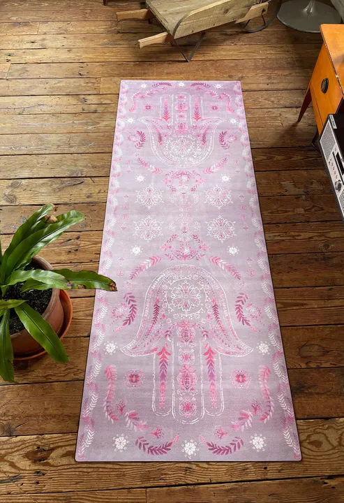 邪悪なエネルギーを遮断するという意味が込められたハムサ(神の手)をモチーフにデザインされたヨガマット。 落ち着いたモーヴカラーを使用し伝統的な柄を繊細でフェミニンな印象に仕上げました。 表面はスエードのような優しい素材感、裏面には環境にもやさしい天然ゴムを使用し、 マットを広げた時に折り曲がることなくピタッと床に敷くことができます。 吸収性、グリップ力を兼ね備え、インテリアとしても活用できます。 厚みは安心感がありクッション性がバランスの良い3mm。 お手入れも濡れたタオル等でサッと拭くだけで、水に濡れても大丈夫な楽ちん素材です。