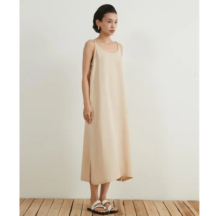華奢なストラップが大人の雰囲気を醸し出す、贅沢なキャミソールワンピース。身体のラインをすっきりときれいに品良く見せてくれる、タイトすぎないラインが魅力で、細めのストラップがシンプルな中にアクセントを加えてくれるデザイン。ミニマルな印象で1枚で潔く着用したり、ノースリーブトップスやTシャツを合わせるカジュアルスタイルもおすすめ。 サイズ  着丈  バスト(cm)   S   108   88    M   110   92   素材:レーヨン 100% 透け感:なし 生地の厚さ:普通 光沢感:ややあり 裏地:なし 家庭洗濯:可能(ネット使用) 【注意点】 ※撮影商品はサンプルの為、実際の仕様と異なる場合がございます。 ※画像の商品は光の照射や角度、お使いのモニター環境により、実物と色味が異なる場合がございます。スタジオ物撮りの画像が実物の色味に一番近くなっております。 ※予約商品の場合、お届け予定はあくまでも目安となります。 生産の都合上、お届け時期が前後したり実店舗入荷時期とずれる場合がございますので、あらかじめご了承ください。 ※表記サイズは商品の実寸です。 ※布製品の特性上、サイズ表の実寸法は多少の誤差が生じる場合がございますので、予めご了承ください。