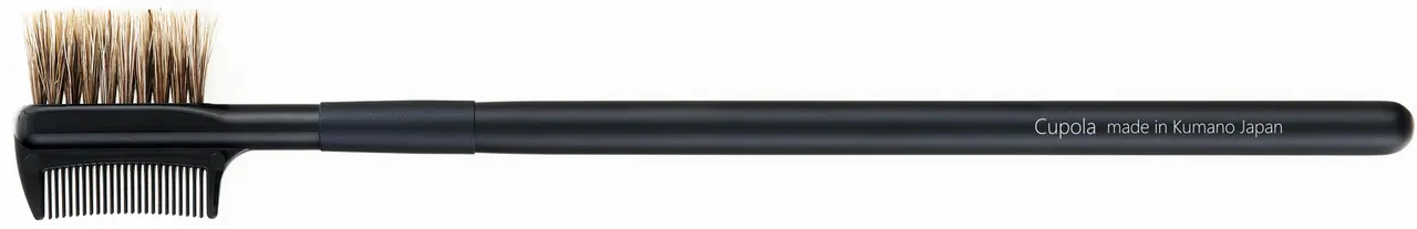 B 002【EYE BROW BRUSH & COMB / アイブロウブラシ&コーム】 馬振毛を使用したブラシは、濃くなってしまったアイブロウをボカしたり、眉を整えるのに適しています。 市場には中々見かけない柄の長さも、手が動きやすいように長くし、繊細なメイクが求められる目周りに適しています。 ◆POINT◆ コームは、ダマになってしまったマスカラを取る時や眉カットをするときに長さを整えるのに適しています。ダマやムラになりやすい眉マスカラの量を整えるのにも最適です。 ブラシは、眉ペンシルで眉を描いた後にぼかすと、均一で整った眉に仕上がります。その後、眉パウダーで必要な部分を足すと完璧な眉になります。 ◆Cupola made in Kumano◆ ・Cupolaのメイクアップブラシは、サステナビリティ、デザイン、機能性を兼ね備えた製品です。大手化粧品メーカーと同じ工房で作られ穂先の信頼性を保証する一方で、20年以上のキャリアを持つメイクアップアーティストNATSUKAがプロデュースしています。 ・伝統産業である熊野筆は、毛先を切らずに職人の手技で穂先の形状を整えることで、穂先の柔らかさを実現し、肌へのやさしい触感を特徴としています。 ・柄のビジュアルは、黒色を用いることで高級感とエレガンスを演出し、マットな質感でカジュアルさも兼ね備えています。また、持ちやすさと使用感の快適さを追求し、柄の長さ・太さ・細さも最適化されています。 ・メイク初心者からモチベーションが高い人々まで、そしてジェンダーレスかつエイジレスに心地よく使っていただけるように配慮しています。 ・海外から旅行などに来られる方々にとっても、日本の伝統工芸品である熊野筆は最適な商品です。熊野筆は世界でも人気が高く、Cupolaのエッジの利いたデザインは、Shopや百貨店様でお土産としても大変ご好評をいただいております。海外からのお客様へのギフトとしても最適であり、Londonのセレクトショップでも地元のお客様に大変ご好評いただいております。 ・ご友人やパートナーへのギフトとして、ホワイトデーやクリスマスなどのシーズンギフト、お土産としても喜ばれる商品であることも重視しています。価格帯は¥1,100~¥6,000と幅広く、迷ってしまう方にはセットブラシもご用意しています。心温まるギフトは本当に喜ばれますし、送った方も喜んでくれる商品です。 ・A4三つ折りリーフレット、ギフト用の価格未記載リーフレットのご用意があります。 ・Cupolaのキービジュアルであるロゴとイラストは、世界的メゾンや百貨店に作品を提供するなど世界的に活躍するイラストレーター、プシェメク・ソブツキ(Przemek Sobocki)がデザインを手がけています。 ・ディスプレイの什器も受注販売しております。工房へ委託する為、2か月ほどお時間を頂きます。