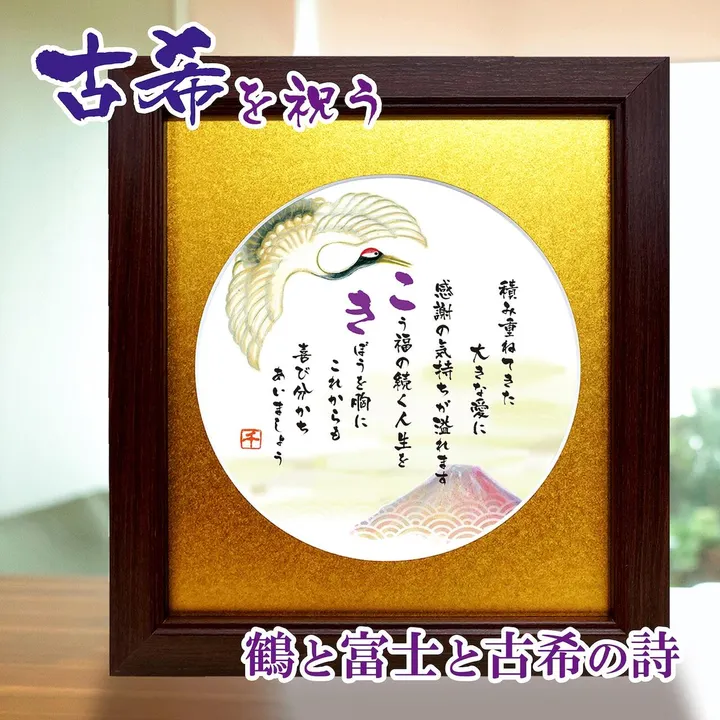 古希 七十歳 節目のお祝いに 想いを伝える感謝の贈り物 お父さん お母さん おじいちゃん、おばあちゃん 大切なあの人へ 「ありがとう」って、いつもは言えないけれど 感謝の気持ちを伝えたい おめでとう!長生きしてね!ずっと仲良く幸せに! そんな想いにピッタリな心温まる メッセージポエムのプレゼント 富士山や鶴は長寿や幸せを象徴しており、お祝いの気持ちをより一層伝えてくれます 【商品情報】 作品はプリント品です(直筆ではございません) 額:ガラス&木製 スタンド:木製 白い化粧箱入り 壁掛け、立てかけも可能 【サイズ】 額の外形:30×31×1cm 内径:24×27cm 【色紙サイズ額色】 茶色 ※当商品は古希を迎えられる方に贈られるギフトです。 ※お届け商品には金額などお買い上げに関する伝票はお付けしていません。 ※ガラス製ですのでお取り扱いはご注意ください。 ※商品画像については、モニターによって色味が若干異なります事ご了承ください。 【贈る方】 自分 両親 お母さん お父さん おじいちゃん おばあちゃん 祖父 祖母 友人 パートナー 父 母 旦那 夫 妻 嫁 先輩 同僚 上司 友達 家族 男性 女性 【用途】 長寿祝い 喜寿 贈り物 感謝 ギフト 周年記念 サプライズ 応援 お祝い 記念日 誕生日