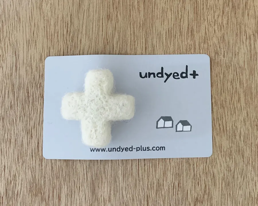 プラスの形をしたかわいいフェルトのブローチ。 ふわふわの羊毛を使って、もんで縮絨させてプラスの形にしていきます。最後はフェルト用のニードル針でチクチクと形を整えていきます。小さいけれどとても手間のかかったブローチです。 ひとつひとつ、手仕事で作られたこのフェルトブローチは縫い目がないのでフォルムも立体的でかわいらしくちょっとしたアクセントにピッタリです。 手作りのほっこりしたあたたかさを感じてください。 セーター、かばん、小物なににつけてもかわいいですよ。