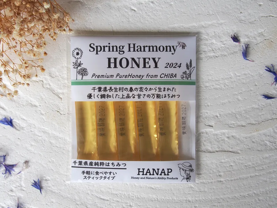 春の陽だまりのようにやさしく、花々が調和するようにまろやか。 “Spring Harmony HONEY(スプリング ハーモニー ハニー)” は、千葉県長生村の春に咲く多彩な花々から生まれた、上品でやさしい甘さが魅力の 国産・純粋はちみつ です。 春の野に広がる花々、果樹に漂う花の香り、木々の芽吹き——。 みつばちたちが春の景色をそのまま瓶に閉じ込めたような、軽やかで親しみやすい味わいが特徴。 クセが少なく、どんな食べ物や飲み物にも寄り添ってくれる 万能の春はちみつ です。 ■ 春のハーモニーを感じる、やさしい味わい ・ふんわりと優しい花の香り ・すっきりとした甘さで、後味が軽い ・子どもから大人まで食べやすいまろやかさ 季節の移ろいと自然の恵みをそのまま味わえる、春だけの特別なフレーバーです。 食卓のあらゆるシーンに寄り添い、自然のままの甘さで日常をそっと彩ります。 【スティックタイプで、国産はちみつをもっと手軽に日常へ】 Spring Harmony HONEY は、便利なスティックタイプでご用意しています。 スプーンいらずで手も汚さず使えるため、 ・スポーツや登山中のエネルギー補給に ・防災バックに入れて非常時の備えに ・勤務先でのコーヒーや紅茶に ・出先で喉が不調のときに ・小腹が空いたときに ・1食分だけちょっとほしい時に など、シーンを選ばず簡単に使えるのが魅力。 持ち運びにも衛生的で、「はちみつをもっと生活に取り入れたい」方にぴったりです。 また、ちょっとした御礼などのプチギフトにもオススメです。