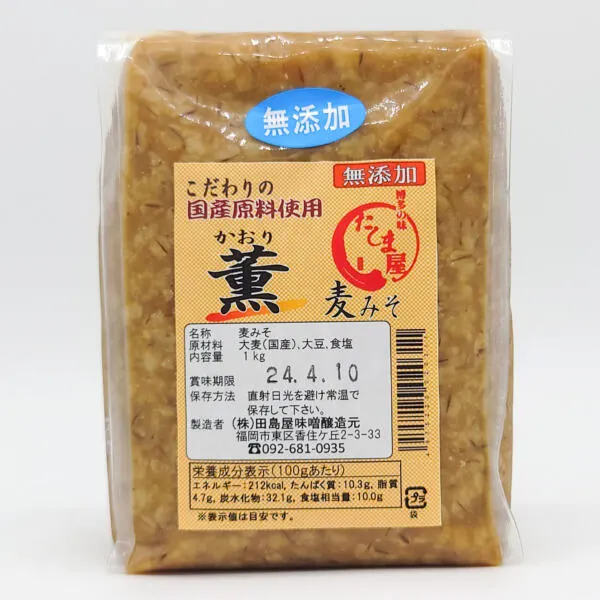 福岡県産大豆「ふくよかまる」と国産の大麦を使用したこだわりの麦みそです。麹歩合は20割と高めで塩分は控えめの10%。職人が一仕込みずつ手作業で仕込む無添加仕上げで、麦麹の香ばしさとコク、芳醇な香りが特徴の本格派です。