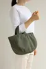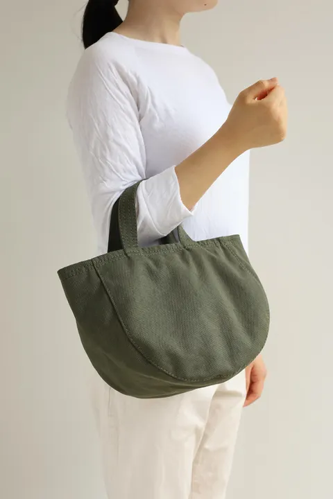 厚手のキャンバス生地にボールドなスティッチ。 コロンとしたシルエットが印象的なトートバッグ 開口部にスナップボタン、内側にファスナー付きポケット1つ。