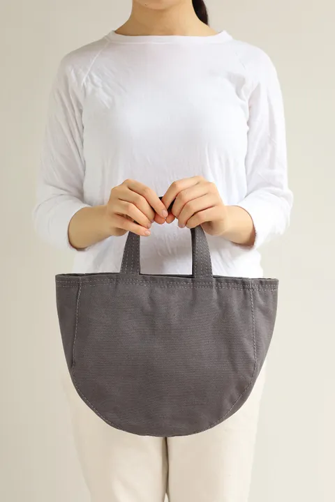 厚手のキャンバス生地にボールドなスティッチ。 コロンとしたシルエットが印象的なトートバッグ 開口部にスナップボタン、内側にファスナー付きポケット1つ。