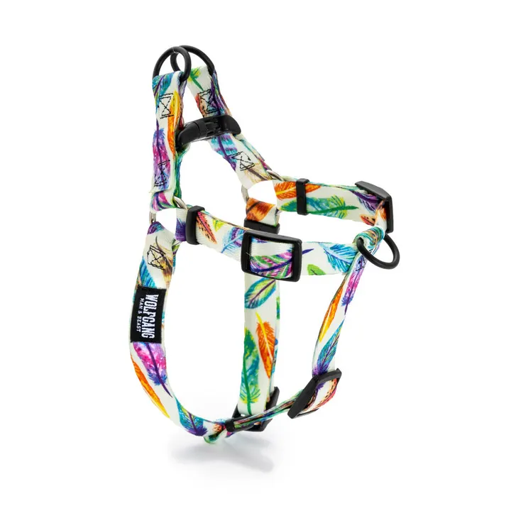 犬用のハーネス。 WOLFGANG MAN & BEAST のリードやカラー(首輪)は、車のシートベルトなどにも使われる、強度と柔らかさ、耐久性を兼ね備えたポリエステル100%のウェビング素材を使用しています。 水を吸い込まない、極細のポリエステル糸を非常に密に編むことによって、海や川でも使用可能、汚れや臭いもつきにくい特徴があります。 さらに、ウォッシャブルで洗濯も可能。 アウトドアでの使用にもピッタリです。 製法には、ウェルディング製法( 生地を熱で溶かすことによって生地同士を接着し、強い耐久性を実現する溶着製法 )を採用。 糸による縫い目が無いので、飼い主・愛犬にとって快適な使い心地を実現。通常の縫製による擦れからの糸のほつれが生じることがありません。   WOLFGANG MAN & BEAST のすべてのドッグプロダクトは、こだわりのアメリカンメイド。 ドッグプロダクトは、大切なパートナーである愛犬が、長年愛用できるものであってほしい。 その思いから、選び抜かれた素材を使い、品質にこだわり、WOLFGANG MAN & BEASTのすべてのドッグプロダクトはアメリカ国内で生産されています。 【FeatherFriend- フェザードフレンド -】 カラフルなフェザーが印象的なアートワーク。 この美しいキットを身につければ、ドギーファッションの第一人者としての地位は揺るぎないでしょう。 <Sサイズ:対応犬種の目安> ジャック・ラッセル・テリア/パピヨン/マルチーズ/シーズー/ヨークシャーテリア/キャバリア/ホワイト・テリア/ミニチュア・ダックス ...etc <Mサイズ:対応犬種の目安> パグ/コッカスパニエル/シュナウザー/ボストンテリア/フレンチブルドッグ/オーストラリアン・キャトル・ドッグ/スタッフォードシャー・ブル・テリア/ブリタニー/サルーキ/ビーグル/柴犬/ダルメシアン/ウェルシュ・コーギー/ボーダー・コリー ...etc <Lサイズ:対応犬種の目安> ボクサー/ゴールデンレトリバー/ジャーマン・シェパード/ロットワイラー/シベリアン・ハスキー/ブルドッグ/コリー/アメリカン・ピットブル・テリア ...etc 上記の犬種はあくまで目安です。個体によりサイズは変わりますので、購入前に必ず愛犬の実際のサイズを計測して適合サイズを確認してください。