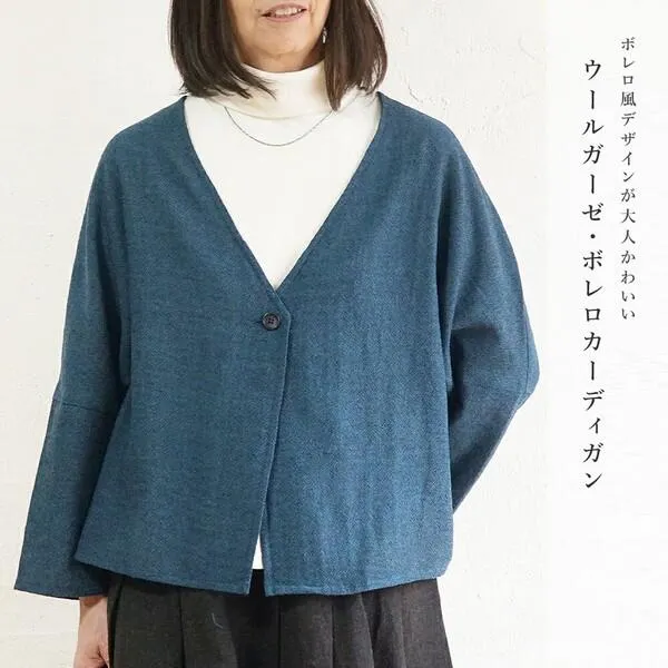 ボレロ風デザインが大人かわいい 【ウールガーゼ・ボレロカーディガン】 大人かわいいボレロ風のデザイン、薄手のウール素材で軽くてやさしい暖かさが魅力のカーディガン。 ゆったりシルエットでラフに羽織ることができ、Vネックと一つボタンですっきり感を演出。 ラフにさっと羽織れてお出かけはもちろんおうち時間にもピッタリ◎ ちょうどいい着丈で合わせるボトムを選ばず、カジュアルにもきれいめにも活躍してくれます。 暗くなりがちな冬コーデのアクセントになってくれる「ブルー」 柔らかいナチュラルな着こなしに仕上げてくれる「ベージュ」 コーディネートを引き締めてくれる「ブラック」 大人のきれいめコーデにおすすめな「グレー」 すっきり見せてくれるVネック。 ゆったりと羽織れるボレロ風のデザイン。 タックあり。 軽くやさしい暖かみのあるウール素材。 さっとまとえる軽さで一枚あるととても便利な素材感です。 お手入れ方法:ドライクリーニング ◆お取り扱い上のご注意◆ ・この製品は素材の特性上、着用中の摩擦や洗濯により毛羽立ちや毛玉が生じることがあります。 連日の着用は避けてください。 ・着用後ブラッシングや毛玉取り器でお手入れしてください。また繊維がからみついた際は、ブラシなどでほぐし、毛玉は毛玉取り器またはハサミで丁寧にカットしてください。 ・編み目が他のものに引っ掛かりやすいため注意してください。 ・乾燥機のご使用は収縮が大きいため使用しないでください。