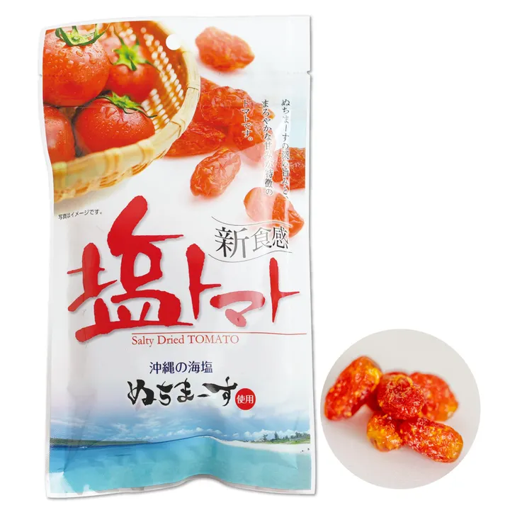 甘くて酸味の効いたトマトにミネラル豊富な沖縄海塩ぬちまーすを使用。 ギネス認定のぬちまーすの深い旨味とトマトのまろやかな甘みが特徴の新食感ドライトマトです。 ジップ付きで持ち歩け、食べやすい粒タイプです。夏や以外と多い冬の熱中症対策にも大活躍の塩トマトで塩分チャージ!! 商品仕様 シリーズ名 ドライフルーツ ブランド名 沖縄美健販売 原産国/製造国 タイ・日本/沖縄 総重量 1ケース30個入り(約3.5㎏) 単品重量 110g 保存方法 高温多湿、直射日光を避け常温で保存して下さい。 栄養成分表示 【100gあたり】エネルギー/348kcal、たんぱく質/0.3g、脂質/0.5g、炭水化物/85.5g、食塩相当量/1.1g 原材料 トマト(タイ産)、砂糖、海水塩(沖縄産)/酸味料(クエン酸)、酸化防止剤(亜硫酸塩) 賞味期限 製造日から12ヶ月