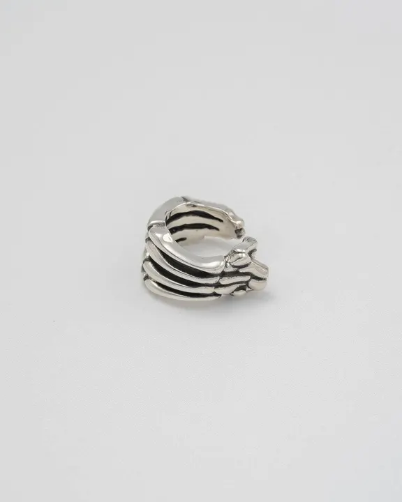 "Skeleton" series 人骨を忠実に再現した、骨の手が耳を掴むような形のイヤーカフ。 高度な彫刻技術で生み出されたシンプルながらも迫力のあるScat独自のデザインです。 艶出し加工によるシルバーの独特な光沢に加え、燻し加工を施しています。