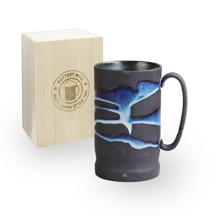 陶器(pottery)製の大きなマグカップです 大容量の600cc入ります ロング缶も1本丸々入る大きさです 職人の手によって一つ一つ柄杓でかける釉薬がそれぞれの商品に違った表情を醸し出します