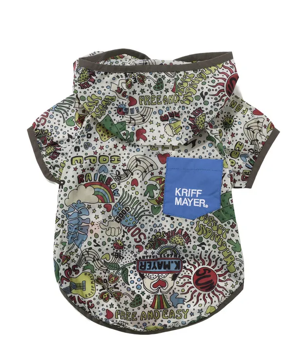 KRIFF MAYERオリジナル総柄の撥水マウンテンパーカーです。 ・世界中の「ありがとう」を集めた感謝柄 ・どこかで見たことのある人物画を手書きタッチで表現したピープル柄 ・ゆるいタッチで和を表現したアニマル柄 撥水防汚機能付きなのでアウトドアに適しており、軽量かつファスナーで前がガバっとあくので 着脱簡単で、わんちゃんにもオーナー様にもストレスなくご利用いただけます。 総柄とポケット配色で目立つこと間違いなし! 他にないドッグウェアで他のわんちゃんと差別化できる一枚です。 ■CLEANNESS(クリーネス) この商品は、撥水・防汚加工を施した商品です。 完全防水ではないので、強い雨等に長時間あたると水分が浸透します。 内側からの湿気も通すので、ムレにくい特性を持ちます。 ※撥水/防汚加工は永久ではありません。 工場にて30回洗濯後に、効果に変わり無い事を確認していますが、使用状況や洗濯方法で個体差が出ますのでご了承下さい。 ※アイテムによってサイズ感が異なる為、数値をよくお確かめください。