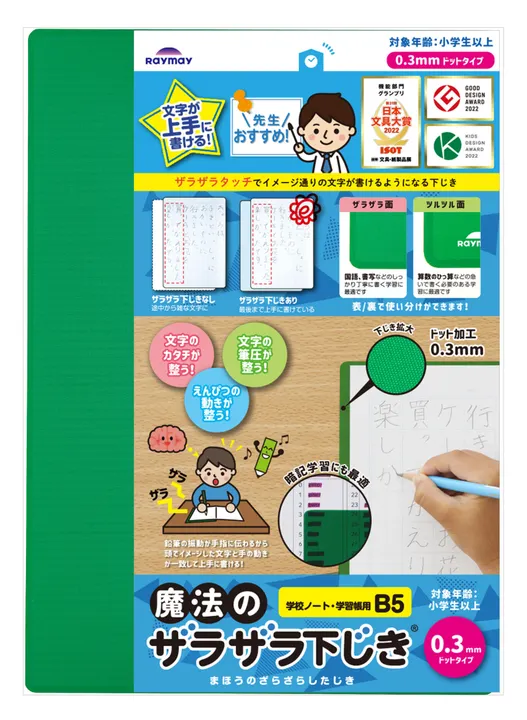 【ザラザラタッチでイメージ通りの文字が書ける】 下じき表面に施した細かいドット加工により、筆記時に鉛筆の動きを振動としてザラザラと手や指に伝わることで、頭の中にイメージした文字と手の動きが一致しやすくなります。 表側のザラザラ面は、国語や書写などのしっかり丁寧に書く学習に最適です。 裏側のツルツル面は、算数のひっ算など、急いで書く必要のある学習に最適です。 プリントや横長変形の漢字・計算ドリルに合ったA4サイズと、授業ノート・漢字練習帳などに合ったB5サイズの2サイズ展開。 ドットの大きさも学年によって選べる2タイプございます。