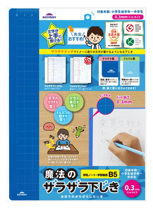 【ザラザラタッチでイメージ通りの文字が書ける】 下じき表面に施した細かいドット加工により、筆記時に鉛筆の動きを振動としてザラザラと手や指に伝わることで、頭の中にイメージした文字と手の動きが一致しやすくなります。 表側のザラザラ面は、国語や書写などのしっかり丁寧に書く学習に最適です。 裏側のツルツル面は、算数のひっ算など、急いで書く必要のある学習に最適です。 プリントや横長変形の漢字・計算ドリルに合ったA4サイズと、授業ノート・漢字練習帳などに合ったB5サイズの2サイズ展開。 ドットの大きさも学年によって選べる2タイプございます。