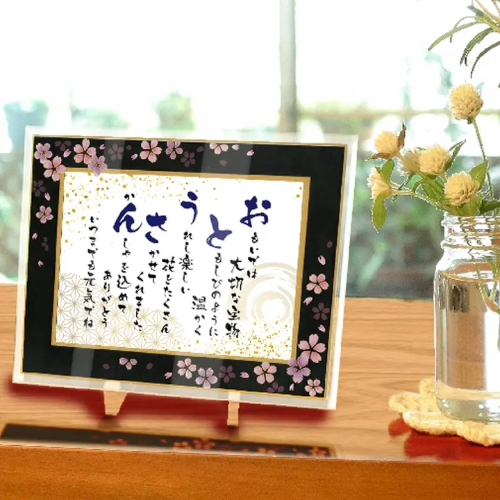 おとうさんへ、ありがとう いつもは言えないけれど、感謝の気持ちを伝えたい。 そんな想いにピッタリのプレゼント。 【商品情報】 作品はプリント品です(直筆ではございません) 額:ガラス スタンド:アクリル 付属のアクリルスタンドで自立します 白い化粧箱入り 【サイズ】 額の外形:19.3cmx24.3cm 作品:2Lサイズ 【和桜ガラスフレーム色】 黒 ※お届け商品には金額などお買い上げに関する伝票はお付けしていません。 ※ガラス製ですのでお取り扱いはご注意ください。 ※商品画像については、モニターによって色味が若干異なります事ご了承ください。 【贈る方】 お父さん 父 パパ 家族 親 男性 【用途】 父の日 還暦祝い 古希祝い 喜寿祝い 傘寿祝い 米寿祝い 卒寿祝い 白寿祝い 百寿祝い 長寿祝い 退職祝い プレゼント 贈り物 依頼 感謝 ギフト サプライズ お祝い 記念日 定年 誕生日 クリスマス