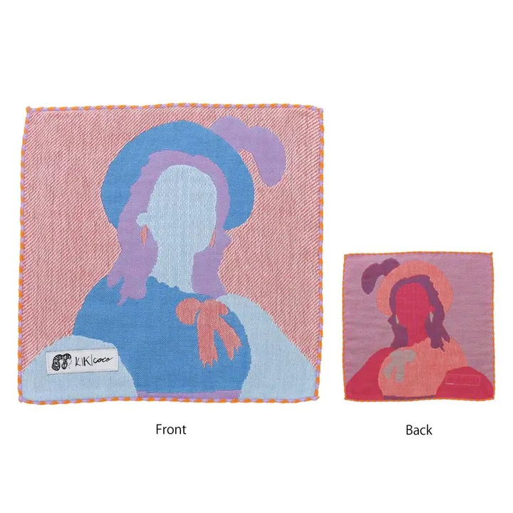[ 貴族の肖像画 × ポップアート ]パリの美術館で沢山の貴族の肖像画に目を奪われたKIKI。 NYでポップアートの魅力に目覚めたCOCO。 “ NOBLE! NOBLE! NOBLE! ”はKIKIの軽いタッチでスケッチした肖像画とCOCOのポップアートからインスピレーションを受けた構成がMashupされて生まれました。 優しい織の風合いが特徴的なシリーズです。 3重ガーゼ 3重織りにすることで目の詰まったしっかりとしたガーゼ生地に仕上げ、ガーゼのやわらかな質感と丈夫さを兼ね備えました。 何度洗っても型崩れしにくく、薄手なので速乾性にも優れています。 表情の違う織り 生地をよく見ると場所によって模様が違います。 それぞれ織り方を変えることによって、使用している色糸以上の鮮やかさと平面なガーゼの中に立体感を生み出しています。 薄いからこそのメリット 薄手なのでポケットや鞄に入れてもスペースを取りません。 トレンドのミニバッグにもぴったり。 またインテリアとしてもお部屋を華やかに彩ります。 小物の下に敷くのも可愛いですが、額に入れて絵画のように飾るのもおすすめです。