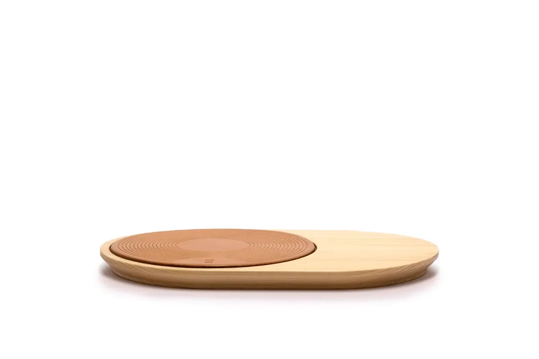 ヒノキの多目的トレイ。地元の多摩産材を高尾の木工で加工された木製品。円型の凹みには PineSkins や皮のコースター(別売、セット商品あり)がぴったりはまります。ウレタンの仕上げにより、日常使いやすいです。