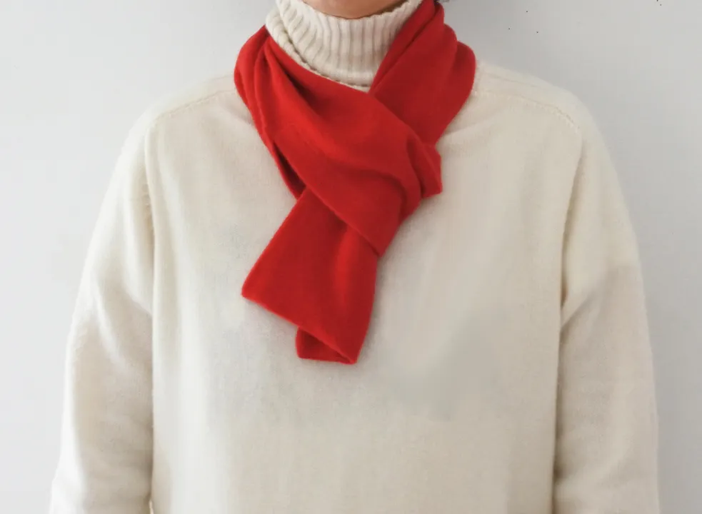 カシミア100パーセントのニット地で作ったふわふわのミニマフラー。 片方の端がループ状になっており、反対側の端をそこに通すだけで簡単につけられます。 コートにはもちろん、小さ目サイズなのでセーターや首元のアクセントになります。 屋内でアクセサリー代わりにつけても違和感なしです。 カシミアなのでとにかく肌触りが良くて軽くてあたたかい! お家で首元が寒い時や寝るときにつけていただくのもおすすめです。 軽いのでストレスなくつけられます。 冬のファッションが楽しくなります♪
