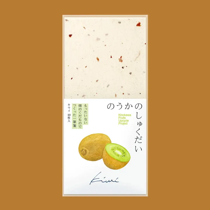 ※ こちらは一筆箋 キウイの販売となります。 ⚪︎ 【キウイ】 10枚入 キウイの力強い果皮がゴロゴロと目立つ 和紙の個性溢れる仕上がりです。キウイの皮は繊維が強く、裏面を触ると皮凸凹を感じられます。冬・春に、新しいシーズンへの希望を込めてお使いいただくのがおすすめです。 ⚪︎くもだの花言葉 『生命力・豊富』 ⚪︎ ホンモノにこだわり、和紙の伝統工芸士さんより製造 くだもの和紙は、1500年の歴史をもつ福井県越前市になる和紙の製造所で、ひとつひとつの作物の特性や配分を見極め、果物の皮や果肉を漉き込んでいます。 私たちが初めて製造所を尋ねた時に感じた、これが作物の一部からできているのかという新鮮な驚きを皆様にも感じていただければと思います。 ⚪︎フルーツペーパー(くだもの和紙)の特徴 フルーツペーパーの風合いで、やさしく伝わる。 ●平滑が程よく、書き心地が良い ●くだものの風合いが可愛い ●和紙の伝統工芸士による製造 ●地域の課題解決の応援になる ⚪︎こんな時にお使いください ●親しい方へのちょっとしたお返し ●感謝を伝えたいパートナーへ ●お見舞い・お中元・お歳暮 ●父の日、母の日、ギフト ●お仕事のご挨拶 etc・・ デジタルでのやりとりがすっかり当たり前になってしまった現代だからこそ、シンプルで心のこもった言葉が、くだもの和紙の風合いによって、やさしく丁寧な印象で伝えることができます。 ⚪︎【のうかのしゅくだい】とは 和歌山県紀の川市の柿で毎年出荷できない「畑のロス」330tあります。他の作物や全国の農園でも同じことが起こっています。美味しくたくさん作るだけでは、果物への愛情はたりません。同じように大切に育てた、捨てざるを得ない畑のロスにも大きな価値があります。まずは果物王国と言われるこの地域の未利用資源を「のうかへのしゅくだい」と捉え、魅力ある宝物にアップサイクルするブランドです。 第一弾として「もったいない畑のくだものでつくった一筆箋」がうまれました。 是非大切な方のプレゼントに一筆箋を添えて温もりをお届けください ⚪︎キウイ生産者コラム 『四十八瀬紀の川ファミリー』 破棄キウイ 約1.6tをなんとかしたい 僕らは旧那賀町で日本一のキウイを目指して生産しています。国産キウイってほんま甘くてうまいですよ。でも、キウイの収穫量の約4~5%(1t)は、変形果や極小サイズ、熟れ過ぎで出荷できず廃棄ですわ。そんなキウイも今回和紙に生まれ変わって、改めてキウイって可愛いなぁって惚れ惚れしてます。