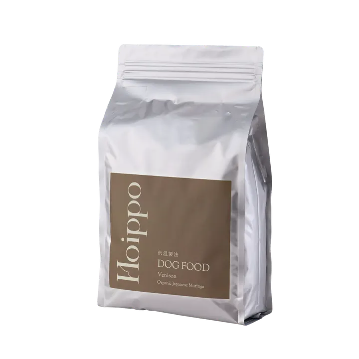 Hoippoのドッグフードシリーズ、国産鹿肉をベースに。 主原料には鹿肉、鹿レバー、国産マグロをフードを50%以上含み食べ応え抜群。マグロは一尾骨や皮も丸ごと含みます。 本製品に使用した「国産モリンガ」は、免疫力や腸内環境を整えるスーパーフード。有機認証を取得した原料を採用しています。 また低温製法仕様は、通常120度ほどで焼き上げる製法に比べ、60度から80度の温度でゆっくり焼き上げるため栄養素が残りやすく、風味のあるフードに。独自の製法を用いることにより、強化剤を含まず総合栄養食の基準を満たした仕上がりになっています。 手作りご飯のお供に、カリカリが苦手なわんちゃんにもおすすめです。 外出先でも持参いただけるお試しサイズの50g、通常サイズは500g、1kgの3種類をご用意。 ぬるま湯をかければウェット仕様に。幼犬から老犬まで安心して食べていただけます。 商品のポイント 1. 低温製法で自然風味や栄養素が残りやすい 2.主原料に国産マグロを骨や皮丸ごと使用 3. 総合栄養食 4. 国産鹿肉、鹿レバー使用 5. 国内工場で製造 一日の標準給与量目安(成犬) 超小型犬 1kg~5kg・30g~103g 小型犬  5kg~10kg・103g ~172g 中型犬  10kg~20kg・172g~289g 成分保証分析値 345kcal(100g) 粗たんぱく質27%以上、粗脂肪9%以上、粗繊維3%以下、粗灰分7%以下、水分10%以下